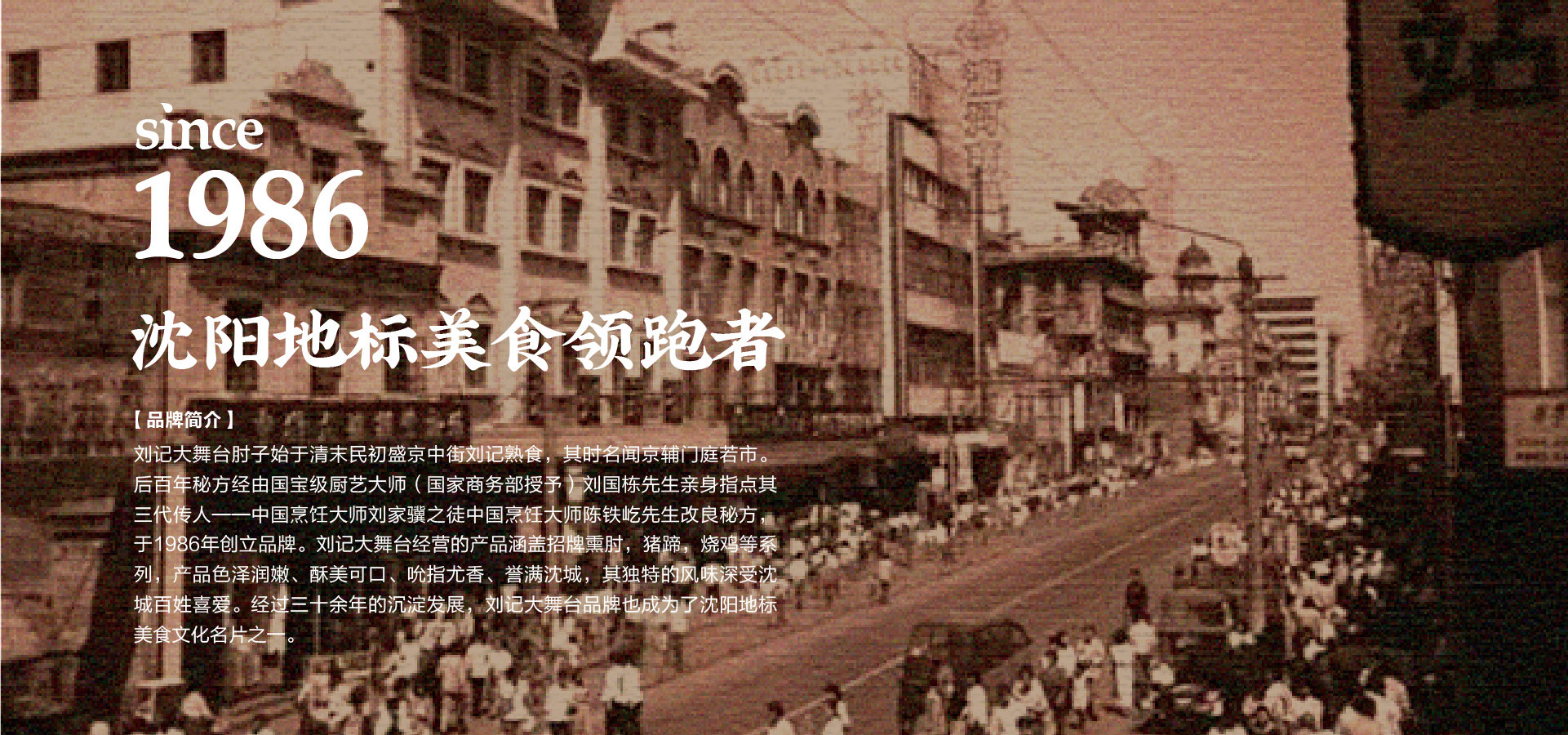 品牌創始人陳鐵屹先生自幼師承遼菜正宗,以發揚傳承遼味為己任。1986年,陳鐵屹先生經師傅指導調制出第一鍋醬湯,自此開始制作熟食,并于市井銷售,食客絡繹不絕。作為中華美食的傳承者、開拓者和創新者,陳鐵屹先生于80年代創立“劉記大舞臺肘子”品牌,開出了第一家門店。基于百年秘方傳承改良,并采用新鮮放心原料,秘用二十幾味名貴藥材,延用傳統工藝專心加工而成,形成了色澤艷麗,酥爛脫骨,肥而不膩,瘦而不柴的風味產品。